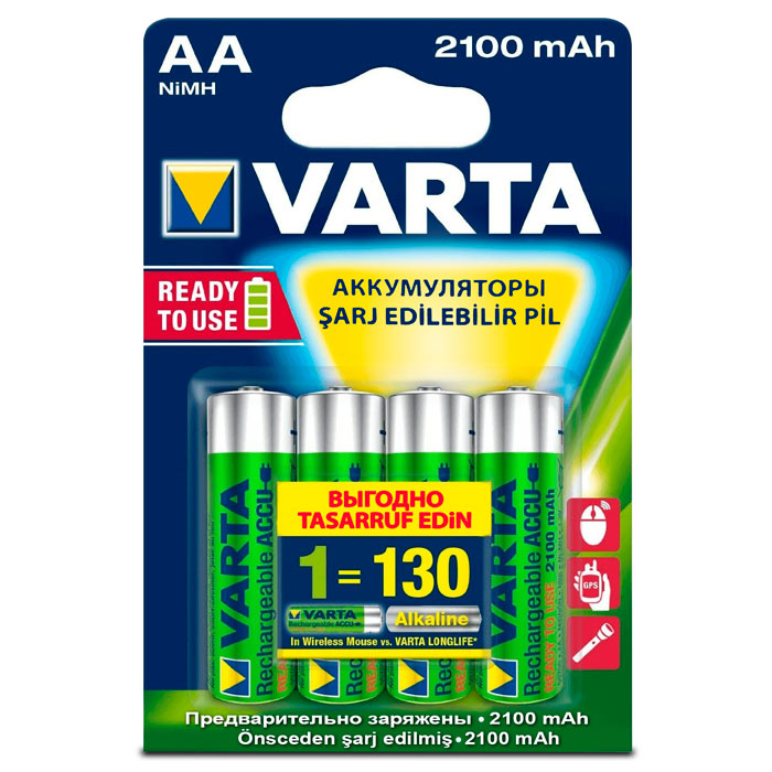 Никель-металлгидридные (Ni-MH) батареи от VARTA обеспечивают как минимум 300 циклов перезарядки, и даже после этого вы можете продолжать их использовать. Аккумуляторы 56706 AA 2100 мАч используются в игрушках, фонарях, рациях, навигаторах, компьютерных мышках, подходят для приборов, находящихся в автономном режиме долгое время. Технологии изготовления аккумуляторов и используемые материалы позволили сохранять до 75% заряда через год. Таким образом саморазряд достаточно низкий и можно использовать перезаряжаемые батарейки в устройствах с низким энергопотреблением. Технология «Ready To Use» означает, что вы можете использовать элементы питания сразу после покупки, без предварительной зарядки.