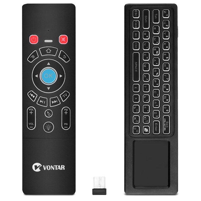 Беспроводная мышь/клавиатура/пульт VONTAR T6 Plus расширяет возможности работы со множеством домашних устройств. Элементы управления находятся сразу с 2-х сторон. На лицевой части расположены основные кнопки для медиаданных и управления в меню, а функция аэро-пульт поможет легко управлять курсором на экране. С обратной стороны находится клавиатура с русской раскладкой. В комплект входит аккумуляторная батарея. Для всех элементов управления с обеих сторон гаджета можно включить подсветку, которая позволит выбрать один из 7 цветов.