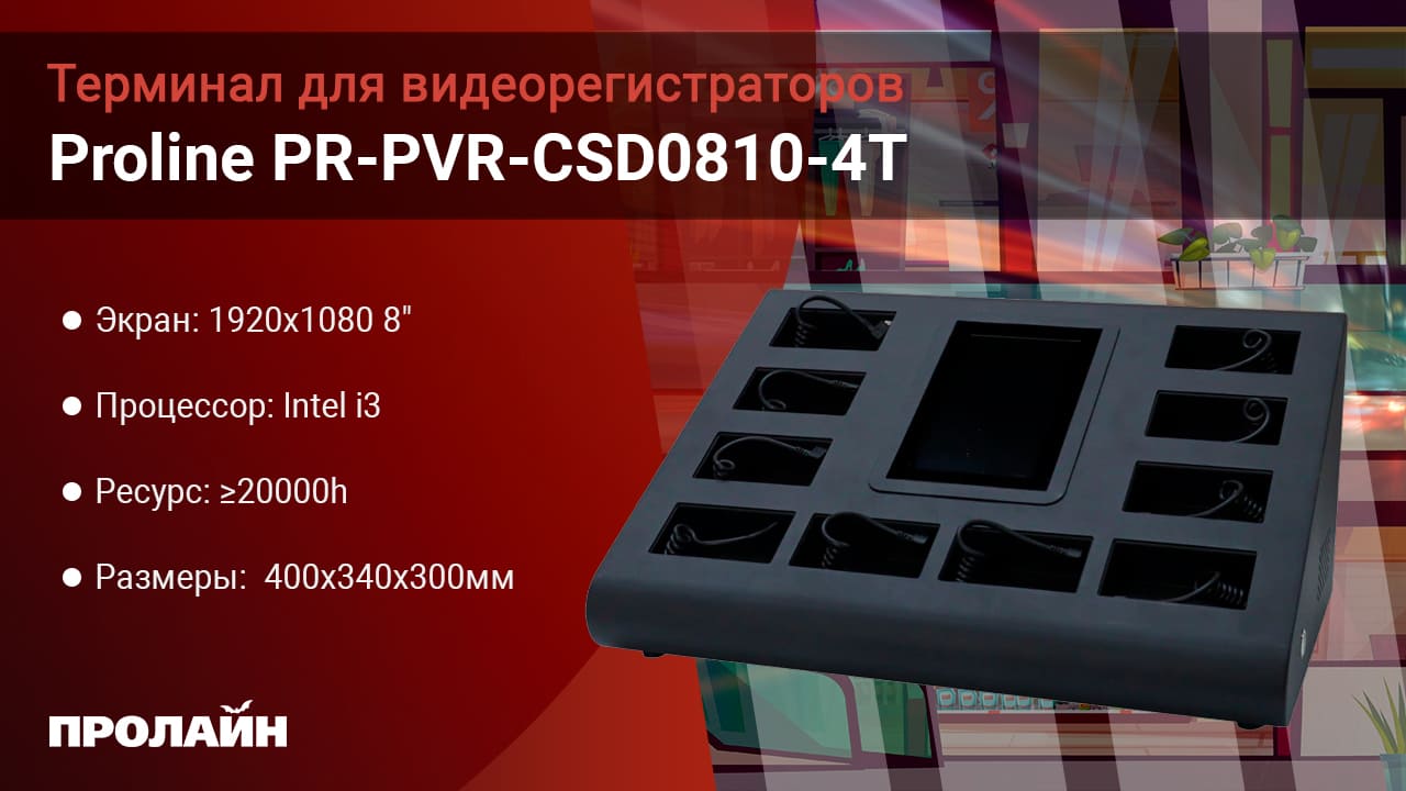 Терминал Proline PR-PVR-CSD0810-4T для видеорегистраторов - это прибор для установки, зарядки, хранения и автоматического считывания данных с видеорегистраторов.