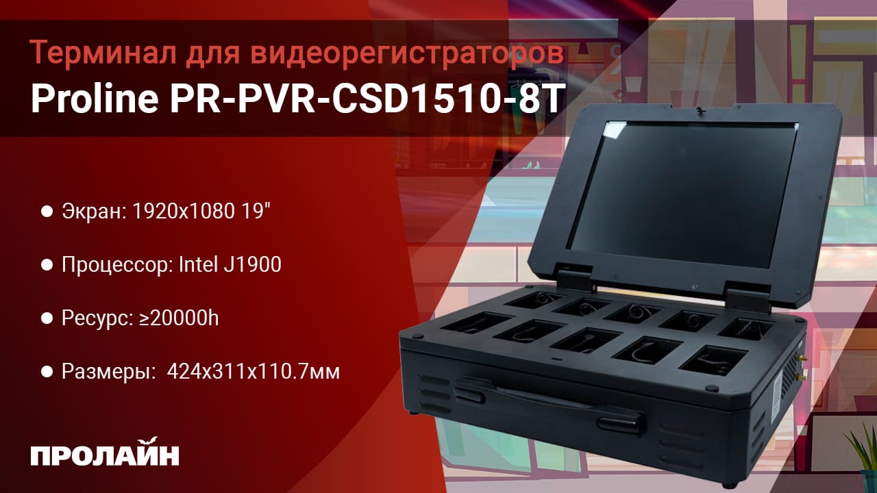 Терминал Proline PR-PVR-CSD1510-8T для видеорегистраторов - это прибор для установки, зарядки, хранения и автоматического считывания данных с видеорегистраторов. С возможностью вывода этих данных на экран терминала или передачи этих данных через Ethernet на сервер безопасности.