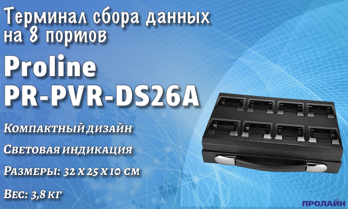 Терминал для сбора данных Proline PR-PVR-DS26A предназначен для одновременного сеанса с 8 персональными видеорегистраторами серии PR-PVRX6A. Устройство имеет посадочные места с MiniUSB-кабелями для сопрягаемых регистраторов. Прибор способен объединить и обеспечить одновременную передачу фото и видеоматериалов на ПК. Сетевой концентратор может также подавать питание на каждый из подключенных устройств.