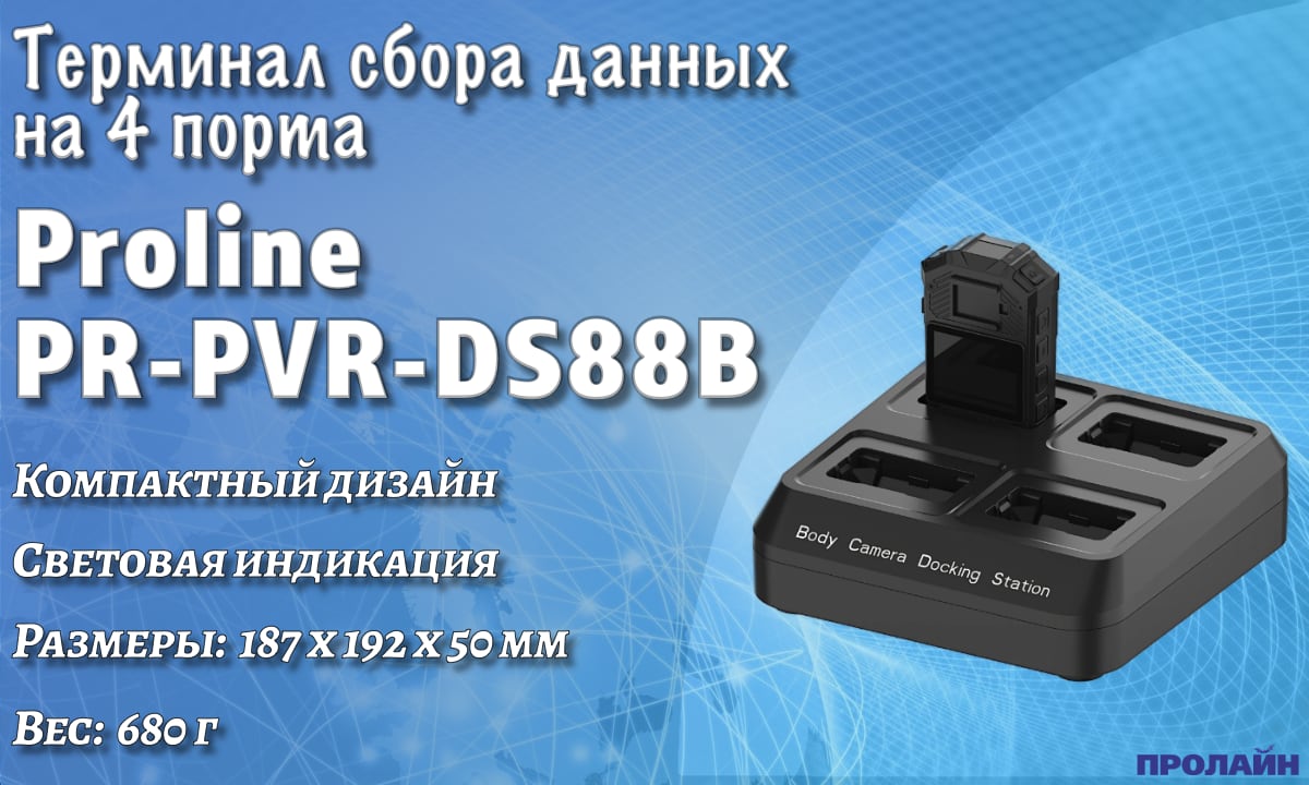 Терминал для сбора данных Proline PR-PVR-DS88B предназначен для одновременного сеанса с 4 персональными видеорегистраторами серии PR-PVRX8. Устройство имеет посадочные места с MiniUSB-кабелями для сопрягаемых регистраторов. Прибор способен объединить и обеспечить одновременную передачу фото и видеоматериалов на ПК. Сетевой концентратор может также подавать питание на каждый из подключенных устройств.
