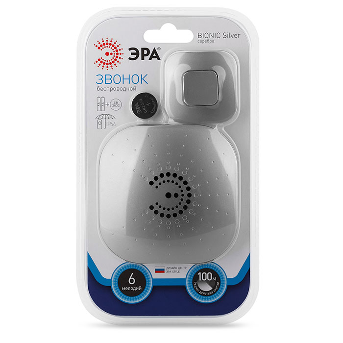 Этот стильный беспроводной звонок разработан в России дизайн-центром ЭРА STYLE. ЭРА BIONIC Silver подходит для любых помещений - квартир, домов, загородных участков. Прост в установке, работает с несколькими кнопками. К одной кнопке можно подключить много динамиков и наоборот - к одному динамику несколько кнопок.