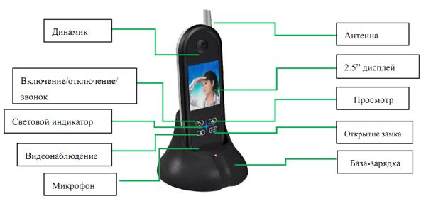 Телефонной трубки со встроенным 2.4" LCD монитором, включающий в себя микрофон для общения с посетителями, динамик, антенну, кнопки управления и цветной дисплей, с помощью которого можно просматривать изображение с вызывной панели или фото, сохраненные во внутреннюю память. Монитор работает от аккумулятора и обладает миниатюрными размерами, поэтому его можно без проблем носить с собой. Кроме того, он комплектуется удобной подставкой/зарядным устройством, благодаря которому можно размещать на горизонтальных поверхностях и удобно заряжать трубку.