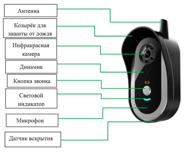 Вызывная панель, которая имеет встроенную фотокамеру и кнопку звонка. Вызывная панель устанавливается рядом с входной дверью и имеет функцию автоматического создания фото, при нажатии кнопки звонка на вызывной панели. Фотографии сохраняются на внутреннюю память в переносной трубке. Максимальное количество фотографий 10 штук. Питание вызывной панели осуществляется от электросети 220В. На случай перебоев электропитания вызывная панель имеет встроенную аккумуляторную батарею, которая позволит сохранить работоспособность домофона.
