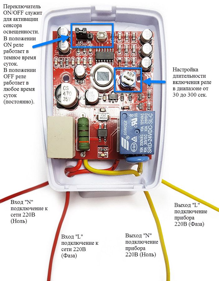 | Длительность включения реле: | 30-300 секунд (регулируемый) |