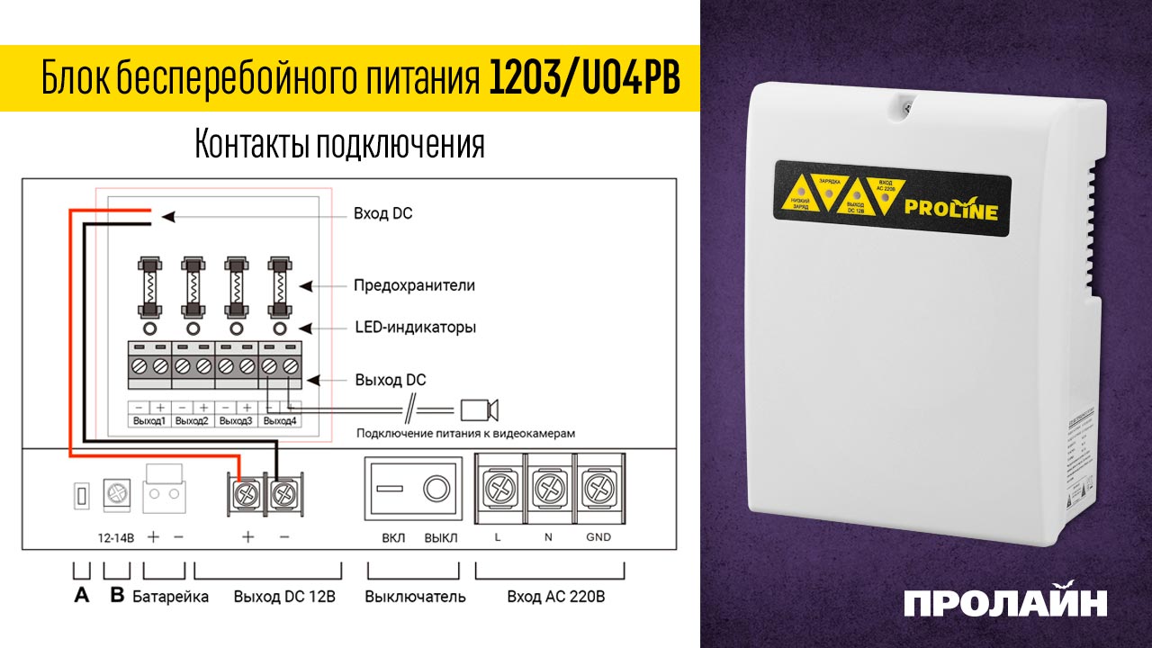 Блок бесперебойного питания 1203/U04PB предназначен для подачи электропитания на различное слаботочное оборудование. Устройство выполнено в прочном пластиковом коробе с возможностью монтажа на стену. Внутри корпуса имеется полость для установки аккумуляторной батареи. Аппарат предназначен для эксплуатации в закрытых помещениях. Диапазон рабочих температур от - 20 до +45 градусов. На передней панели размещены светодиодные индикаторы: низкого уровня заряда батареи, статуса подзарядки, выходное напряжение и статус входного напряжения.