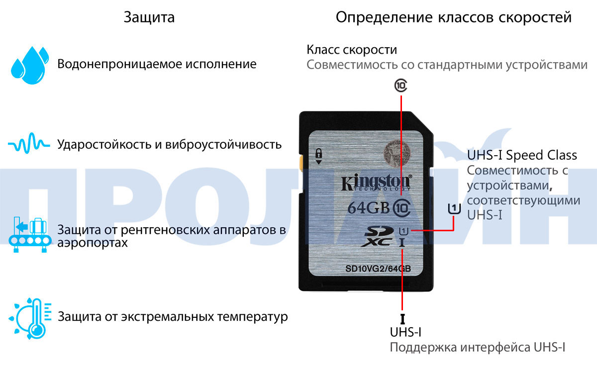 - Высокая скорость работы - современная версия спецификации SD Association UHS-I U1 (Ultra High-Speed Bus, Speed Class 1) гарантирует скорость работы на уровне не менее 10 Мб/с и пропускную способность, достаточную для записи и воспроизведения Full HD видео без задержек.