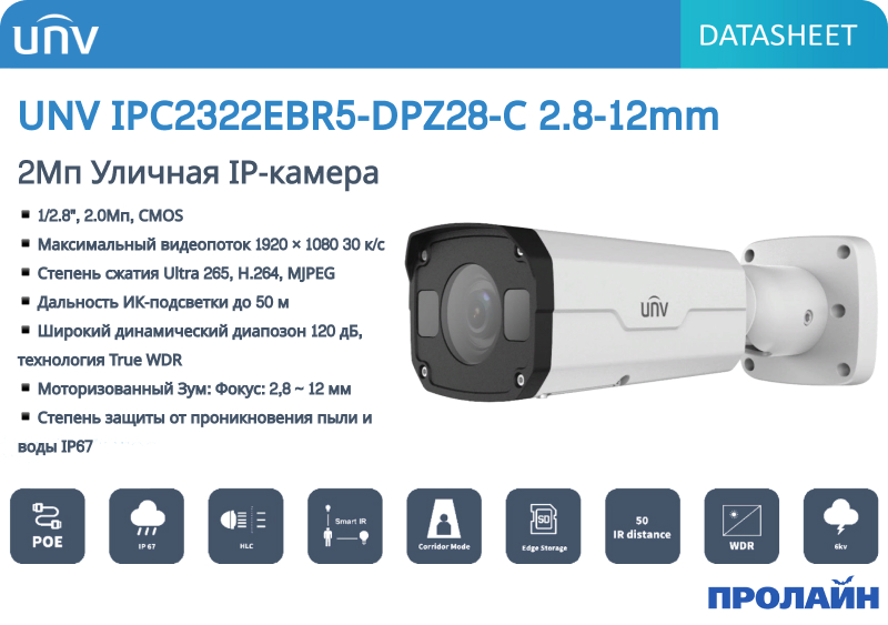 Уличная IP-камера UNV IPC2322EBR5-DPZ28-C 2.8-12mm - выполнена в цилиндрическом корпусе и оснащена всеми необходимыми атрибутами для ведения эффективного наружного видеонаблюдения. Класс защиты устройства IP67 (защита от попадания пыли, временное погружение в воду на глубину до метра). Одним из преимуществ видеокамеры является широкий диапазон рабочих температур от -40 до +60 °С. Встроенная аналитика имеет ряд полезных сценариев, таких как: распознание вторжения, пересечение линии, распознавание лиц, подсчет людей, обнаружение движения, дефокусировка. Благодаря широкоугольному объективу и высокому разрешению камера может использоваться в составе систем видеонаблюдения парковок, офисных зданий, различных социальных объектов или частного жилья.