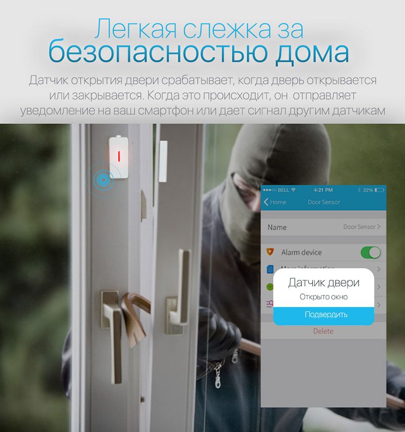 Датчик открытия/закрытия при его установке определяет, когда двери или окна открыты или закрыты и отправляет уведомление, когда это произойдет, а также может отправить сигнал для активации других смарт-устройств.