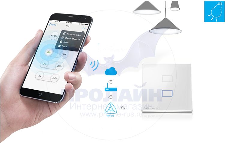 Беспроводной выключатель позволяет управлять освещением из любой точки мира ( дистанционное управление возможно при условии наличия универсального пульта Broadlink RM Pro), где есть интернет. Беспроводной выключатель Broadlink TC2 легко установить, т.к. он монтируется и подключается, как обычный настенный выключатель. Умный Wi-Fi выключатель TC2 управляется через беспроводной шлюз Broadlink RM Pro, или через сенсорные кнопки на лицевой панели как и обычный выключатель. Данные выключатели можно объединить в одну систему и управлять всем светом через смартфон, т.к. система Broadlink построена на модульном принципе.