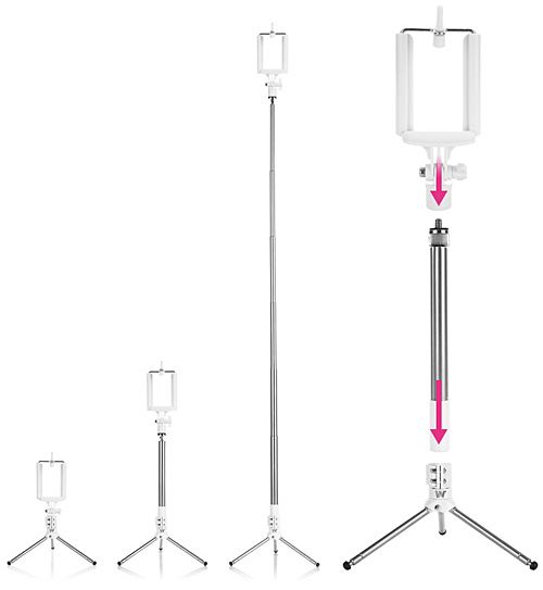 Теперь Вы можете фотографировать себя не только на расстоянии вытянутой руки, но и и на расстоянии действия Bluetooth кнопки, которая встроена в съемную рукоять монопода, установив ваш телефон на напольный или настольный штатив, хоть посреди поля!