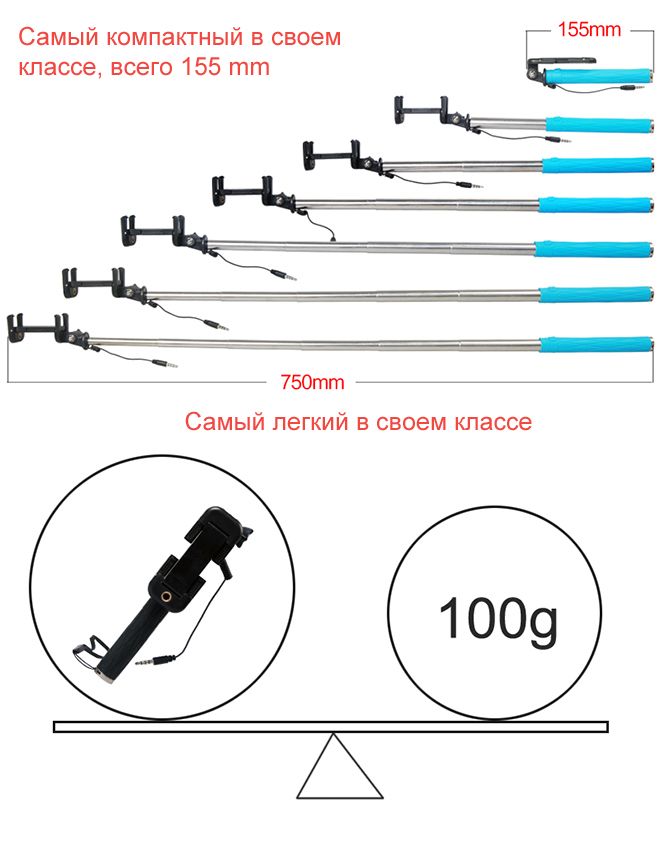 Особенностью и удобством этой модели монопода является компактный размер (всего 155 мм) и встроенная в рукоятку кнопка дистанционного спуска. Связь монопода со смартфоном осуществляется посредством кабеля с разъемом Jack (3,5 мм). Провод подключается в гнездо для наушников