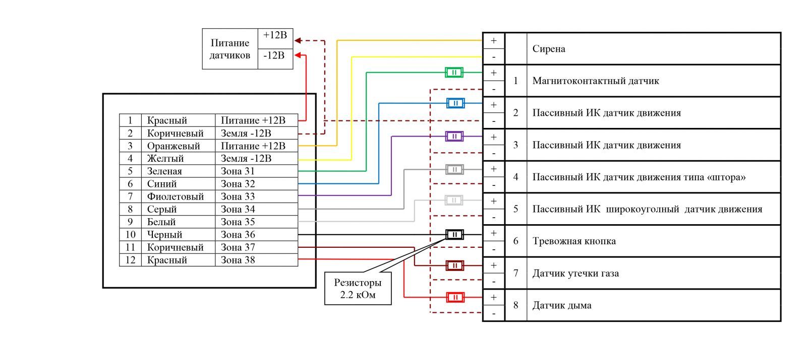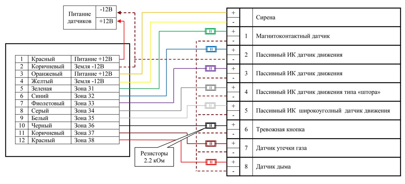 Схема подключения проводных датчиков: