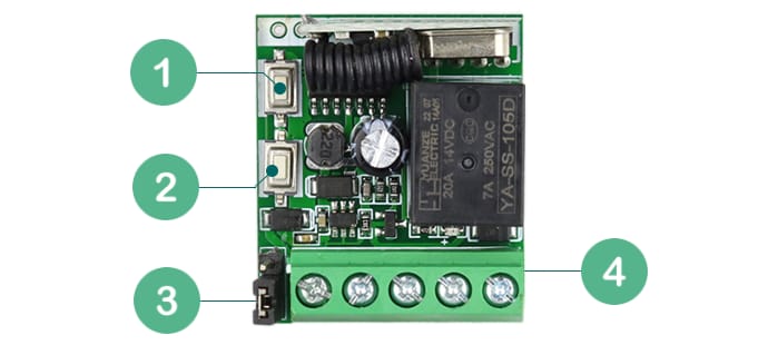 - Для удаления всех брелоков из памяти, нажмите, а затем удерживайте кнопку №2 добавления на реле 5 секунд.