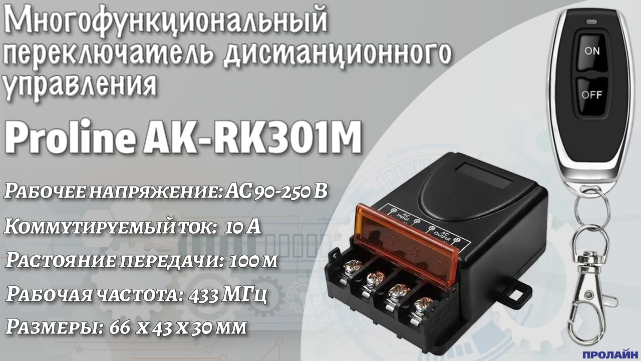 Радиореле с брелоком AK-RK301M работает от источника переменного тока AC 85-250 В и способно коммутировать 250 вольт переменного (AC) напряжения с силой тока до 30 ампер (макс. 3000 ватт). Реле имеет один канал, может работать на расстоянии до 100 м от передатчика, на частоте 433 мегагерц. Устройство поддерживает работу до двадцати брелоков, а процесс их удаление/добавление не занимает даже пары секунд.
