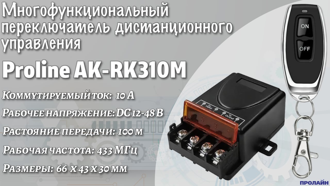 Радиореле с брелоком AK-RK310M работает от источника постоянного тока DC 9-48 В, оно способно коммутировать до 48 вольт постоянного (DC), до 10 ампер (макс. 1500 ватт). Реле имеет один канал, может работать на расстоянии до 100 метров от передатчика, на частоте 433 мегагерц. Устройство поддерживает работу до дватцати брелоков, а процесс их удаления или подключения не занимает много времени.