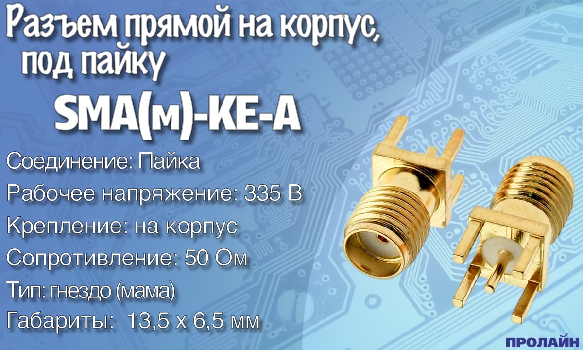 Разъем SMA(м)-KE-A прямой на корпус, под пайку (SMA-F, 1/4-36UNS-2A). SMA (субминиатюрный тип А) – малогабаритный высокочастотный разъем с металлическим наконечником, в котором крепление вилки к розетке осуществляется шестигранной накидной гайкой. Высокочастотный разъем – конструкция, предназначенная для подсоединения различных электронных устройств к электрическим цепям для осуществления согласованной надежной передачи сигналов высокой частоты. При этом в местах соединения потери сводятся к минимуму. Высокочастотные разъемы могут иметь обычные или изолированные корпусы.По способу соединения они могут быть: с байонетным соединением или с резьбовым соединением.