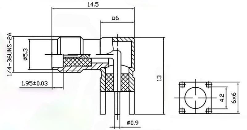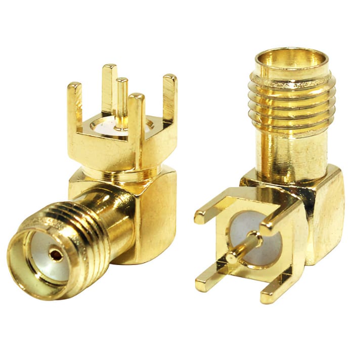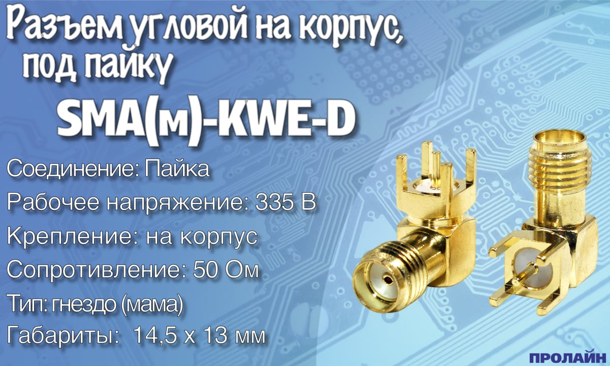 Разъем SMA(м)-KWE-D угловой на корпус, под пайку (SMA-F, 1/4-36UNS-2A). SMA (субминиатюрный тип В) – малогабаритный высокочастотный разъем с металлическим наконечником, в котором крепление вилки к розетке осуществляется шестигранной накидной гайкой. Высокочастотный разъем – конструкция, предназначенная для подсоединения различных электронных устройств к электрическим цепям для осуществления согласованной надежной передачи сигналов высокой частоты. При этом в местах соединения потери сводятся к минимуму. Высокочастотные разъемы могут иметь обычные или изолированные корпусы.По способу соединения они могут быть: с байонетным соединением или с резьбовым соединением.