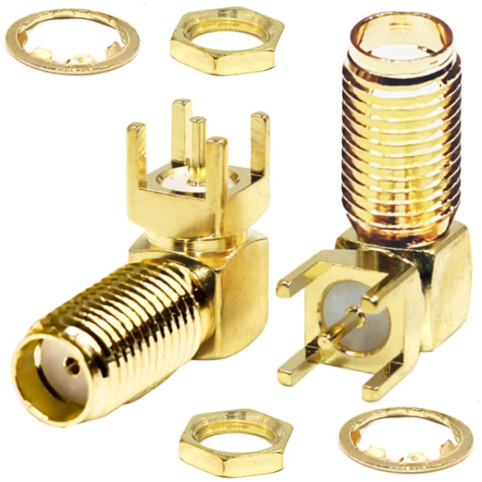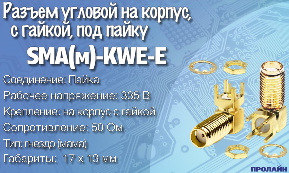 Разъем SMA(м)-KWE-E угловой на корпус, с гайкой, под пайку (SMA-F, 1/4-36UNS-2A). SMA (субминиатюрный тип В) – малогабаритный высокочастотный разъем с металлическим наконечником, в котором крепление вилки к розетке осуществляется шестигранной накидной гайкой. Высокочастотный разъем – конструкция, предназначенная для подсоединения различных электронных устройств к электрическим цепям для осуществления согласованной надежной передачи сигналов высокой частоты. При этом в местах соединения потери сводятся к минимуму. Высокочастотные разъемы могут иметь обычные или изолированные корпусы.По способу соединения они могут быть: с байонетным соединением или с резьбовым соединением.