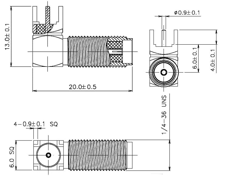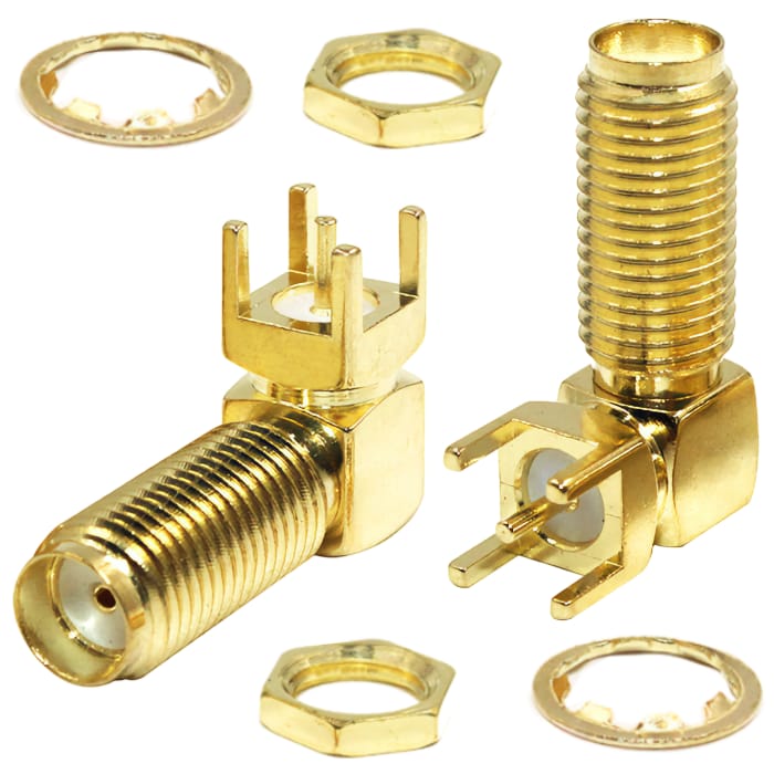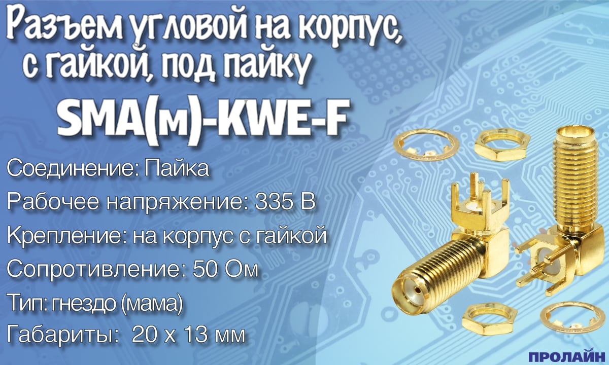 Разъем SMA(м)-KWE-F угловой на корпус, с гайкой, под пайку (SMA-F, 1/4-36UNS-2A). SMA (субминиатюрный тип В) – малогабаритный высокочастотный разъем с металлическим наконечником, в котором крепление вилки к розетке осуществляется шестигранной накидной гайкой. Высокочастотный разъем – конструкция, предназначенная для подсоединения различных электронных устройств к электрическим цепям для осуществления согласованной надежной передачи сигналов высокой частоты. При этом в местах соединения потери сводятся к минимуму. Высокочастотные разъемы могут иметь обычные или изолированные корпусы.По способу соединения они могут быть: с байонетным соединением или с резьбовым соединением.