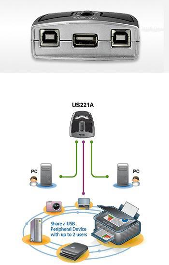 KVM ATEN US221A-A7 - Новые 2-портовые USB 2.0 переключатели для периферии. Модели KVM ATEN US221A-A7 позволяют пользоваться одним многофункциональным принтером или USB устройством, например, сканером или внешним накопителем, одновременно с 2 компьютеров PC и Mac. С помощью переключателей US221A одним многофункциональным принтером или любым USB устройством можно пользоваться с 2 компьютеров PC и Mac одновременно.