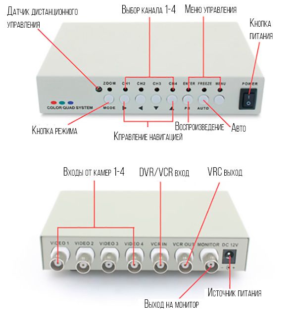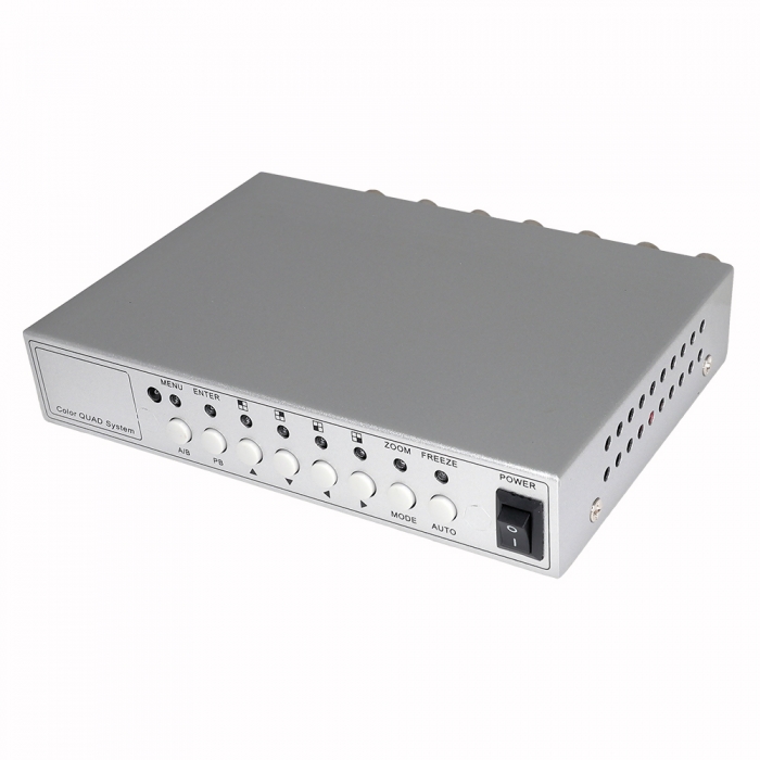 Устройство имеет 4 BNC-входа, экран можно разделить на 2 и 4 канала. Также есть функция размещения на главном мониторе двух или одного дополнительного канала в миниатюре. Устройство позволяет настроить резкость и контрастность для каждого канала отдельно. Поддерживаемый формат цветности PAL и NTSC. Квадратор имеет встроенный динамик, на который выводится тревожный сигнал при потере сигнала или по движению.