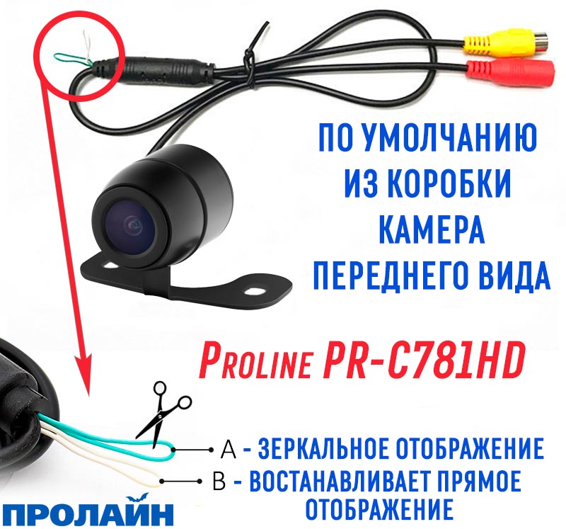 Устройство оснащено широкоугольным объективом с углом обзора в 150 градусов по диагонали и разрешением 2 Мп (1080P). Proline PR-C781HD проста в монтаже и неприхотлива в эксплуатации. Особенностью Proline PR-C781HD является то что напроводе имеется две петли из провода зеленого и белого цвета. При перерезании белого провода камера PR-C781HD приобретает зеркальное отображение. При перерезании зеленого провода - изображение востановится переднего вида.