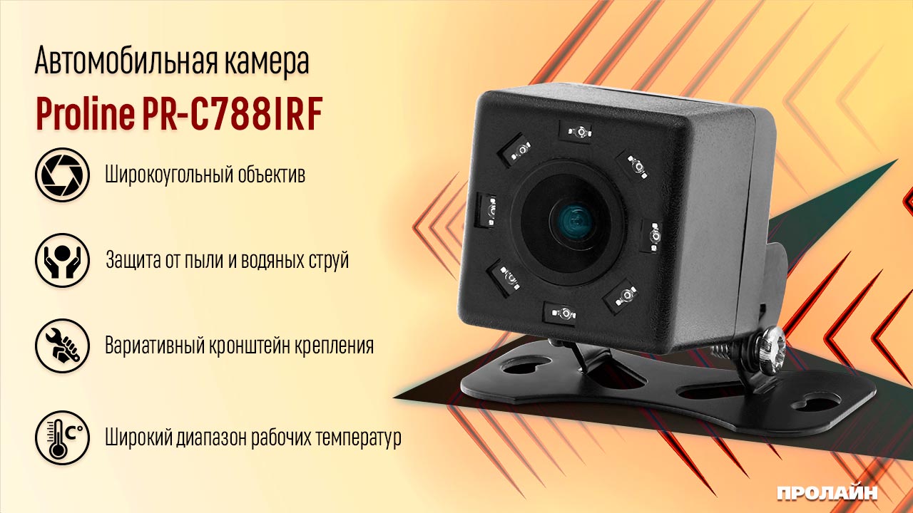 Proline PR-C788IRF - это автомобильная видеокамера переднего вида. Устройство предназначено для наружного использования и имеет широкий диапазон рабочих температур от -30 до +50 градусов. Корпус выполнен во влагозащищенном исполнении и соответствует стандарту IP67 – полная защита от пыли и водяных струй.