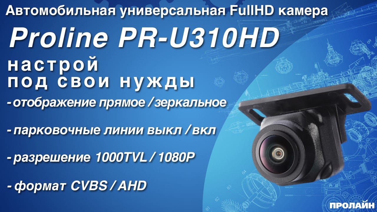 Устройство оснащено широкоугольным объективом с углом обзора в 170 градусов по диагонали и разрешением 1080P (AHD), либо 1000 ТВЛ (CVBS). Камера проста в монтаже и неприхотлива в эксплуатации. Особенностью Proline PR-U310HD является то что на проводе имеется три петли из проводов зеленого, белого и синего цвета. При перерезании синиго провода меняется формат видео сигнала и разрешение с 1080Р AHD на 1000 ТВЛ CVBS, перерезание белоко провода включает парковочные линии, перерезание зеленого провода - меняет отображение с прямого на зеркальное.
