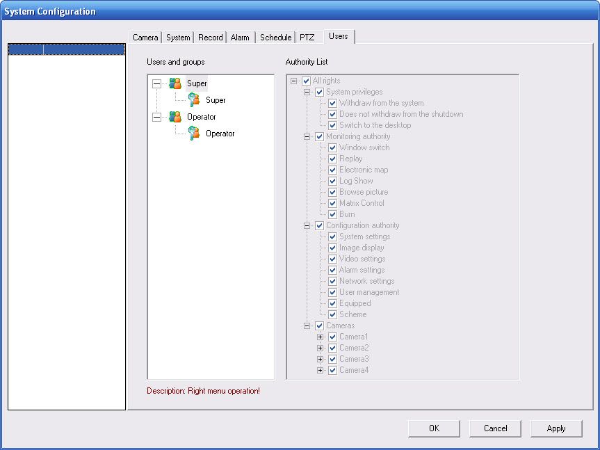 Различные пользователи имеют различные имена, пароли и права в системе, для того, чтобы гарантировать безопасную работу системы видеонаблюдения.