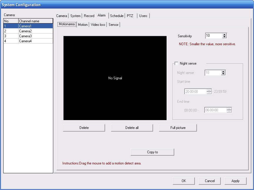 Области обнаружения движения – настраиваемые, 16 областей для каждого канала. Пользователи могут также установить чувствительность обнаружения движения для каждого канала. Система начинает делать запись только, когда в кадре происходит движение объекта, запись автоматически выключается по исчезновению движения в кадре, или после промежутка времени, задаваемого пользователем.
