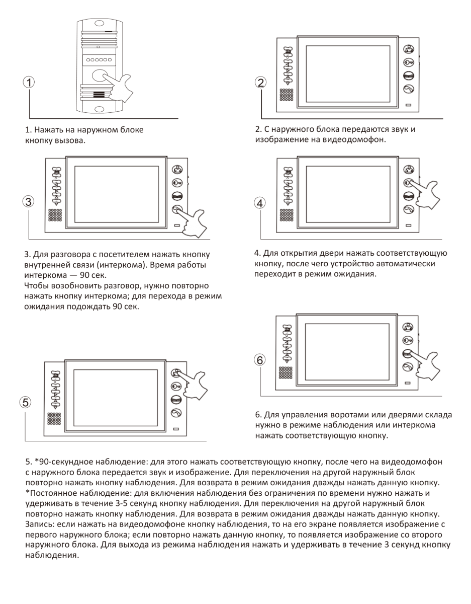 | Дополнительные функции | Прослушивание других мониторов, функция общего вызова, отображение календаря и времени, управление замком через панель домофона |