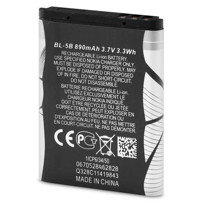 BL-5B 3.7В/890 мАч - это получившая широкое распространение литий-ионная аккумуляторная батарея. Устройство выдает напряжение DC 3.7 вольт и имеет емкость в 890 мАч. Источник питания отличается высокой надежностью и долговечностью в работе, показатель циклов подзарядка/разрядка может достигать 840 раз (в зависимости от условий эксплуатации).