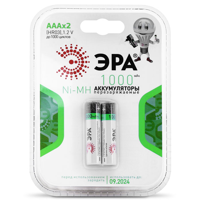 Технические характеристики аккумуляторов Rechargeable ЭРА HR03-2BL AAA 1000mAh: