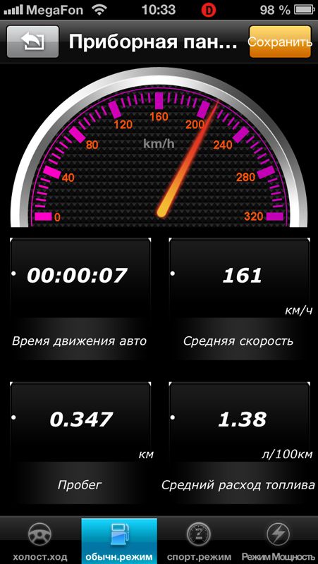 Сохраняет историю диагностики. Параметры тестирования: В статическом режиме: контроль напряжения, расход воздуха, мгновенный расход топлива, температура охлаждающей жидкости, угол опережения, скорость вращения двигателя Круиз-режим: время движения транспортного средства, средняя скорость, дневной пробег, средний расход топлива, текущая скорость автомобиля. Спортивный режим: скорость движения автомобиля, температура охлаждающей жидкости, реальный расход топлива во времени (динамическая кривая), ускорение.