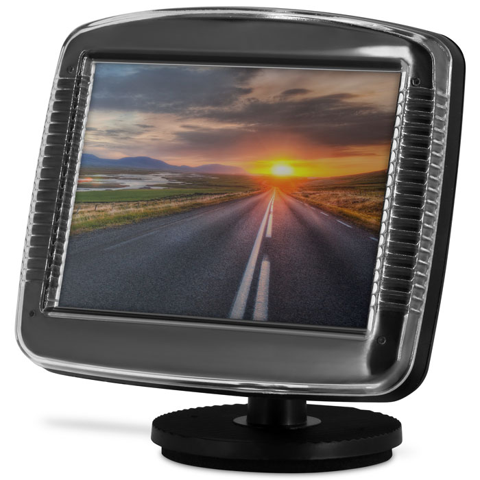 Все это делает PR-E35E очень полезным и удобным инструментом, заметно облегчающим управление автотранспортом. Разрешение экрана составляет 640x480 пикселя, что позволяет просматривать изображение в достаточно хорошем качестве. Надежное крепление с настраиваемым углом наклона по вертикали придает вариативности при установке. Благодаря клейкому основанию кронштейна и небольшому весу, монитор легко и надежно крепится без болтов и саморезов, что позволит избежать повреждения салона при монтаже. Устройство не требует настроек при первом запуске и начинает работу в штатном режиме сразу после включения. Кнопки управления настройками размещены на задней панели и позволяют корректировать контрастность, яркость, выбирать язык устройства и сбрасывать настройки до заводских. Монитор отличается строгим дизайном и небольшими размерами, за счет чего гармонично вписывается в интерьер автомобиля и не мешает обзору.