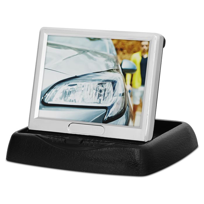 Конструктивной особенностью автомобильного монитора является складывающийся дисплей и широкое основание, устройство крепится надежно и очень устойчиво. Разрешение экрана составляет 640x480 пикселя, что позволяет просматривать изображение в достаточно хорошем качестве. Надежное крепление с настраиваемым углом наклона по вертикали придает вариативности при установке. Благодаря клейкому основанию кронштейна и небольшому весу, монитор легко и надежно крепится без болтов и саморезов, что позволит избежать повреждения салона при монтаже. Устройство не требует настроек при первом запуске и начинает работу в штатном режиме сразу после включения. Кнопки управления настройками размещены на задней панели и позволяют корректировать контрастность, яркость, выбирать язык устройства и сбрасывать настройки до заводских. Монитор отличается строгим дизайном и небольшими размерами, за счет чего гармонично вписывается в интерьер автомобиля и не мешает обзору.