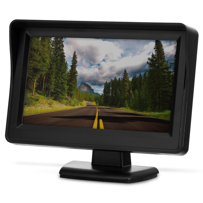 Корпус устройства оснащен встроенным солнцезащитным козырьком и эффективно предотвращает засвечивание дисплея, а надежное крепление с настраиваемым углом наклона по вертикали придает вариативности при установке. Благодаря клейкому основанию кронштейна и небольшому весу, монитор легко и надежно крепится без болтов и саморезов, что позволит избежать повреждения салона при монтаже. Устройство не требует настроек при первом запуске и начинает работу в штатном режиме сразу после включения. Кнопки управления настройками размещены на задней панели и позволяют корректировать контрастность, яркость, выбирать язык устройства и сбрасывать настройки до заводских. Монитор отличается строгим дизайном и небольшими размерами, за счет чего гармонично вписывается в интерьер автомобиля и не мешает обзору.