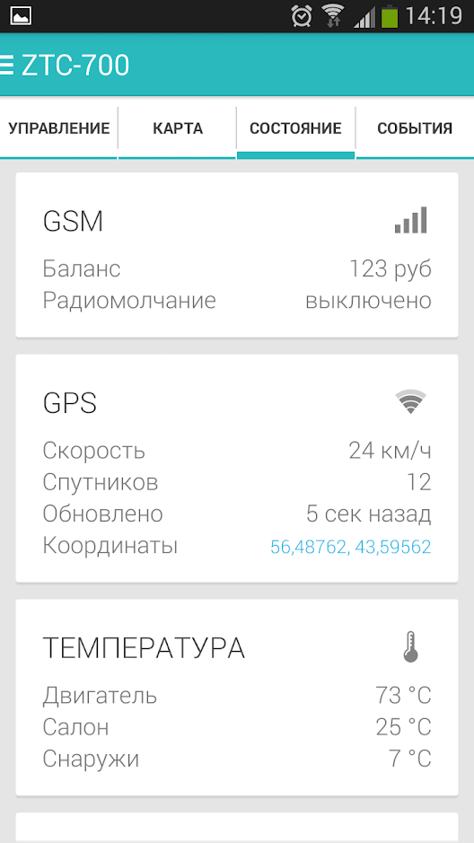 - Функция диагностики двигателя реализована в ZTC-720 и ZTC-720i. При возникновении неисправности в работе ЭСУД (электронная система управления двигателем), выявленных системой самодиагностики OBD-II (EOBD) автомобиля, буквенно-цифровой код ошибки с расшифровкой будет отображаться в списке событий интернет-сервиса, а на номер телефона, указанный в настройках, будет отправлено СМС оповещение об этом событии.