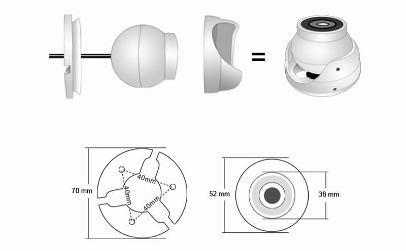 Камера представляет собой купольная антивандальную AHD видеокамеру переднего вида, выполненную во влагозащищенном корпусе для использования в условиях низких температур и повышенной влажности. Монтаж производится на предустановленный кронштейн с возможностью регулировки по двум осям. Устройство оснащено объективом в 170 градусов по диагонали и видеосенсором с разрешением 2 Мп 1920х1080 пикс (1080p). Благодаря встроенной ИК-подсветке с дальностью до 15 метров камера способна вести съемку в темное время суток.
