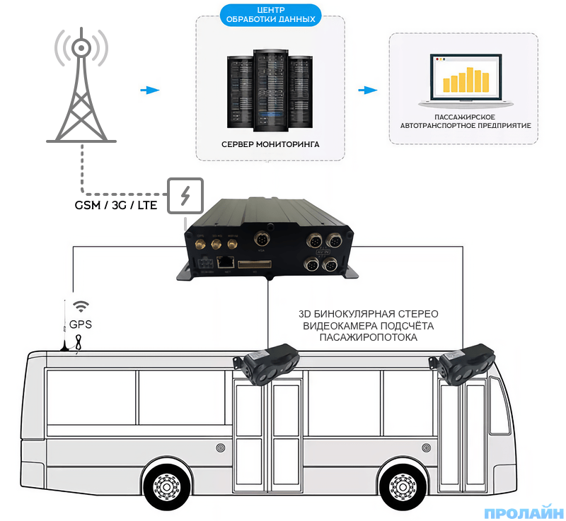 Доступна интеграция сдругими программами аналитики с выгрузкой данных о перевезенных пассажирах с привязкой к остановкам и тарифной сеткой или разработка проекта по техническому заданию заказчика. Система автоматического учета пассажиров состоит из бинокулярных стерео камер Proline PR-2001PC-4PIN и самого терминала - видеорегистартора со встроенным интеллектуальным программным обеспечением, которое выполняет анализ собранных данных. Среди прочего, устройство может быть использовано не только для контроля потока пассажиров (входов и выходов) в автобусах, но и может размещаться в зданиях для подсчета посетителей таких как автозаправки, торговые центры, кинотеатры, театры, стадионы и т.п. 3D бинокулярной стерео камеры Proline PR-2001PC-4PIN камера обеспечивает высокую надежность обнаружения пассажиров и высокую точность с минимализацией ошибок подсчета, в отличии от ИК-датчиков (счетчиков), которые будут считать багаж или домашних животных как людей, есть встроенный алгоритм исключающий подсчет людей ростом менее одного метра, допустим маленьких детей .