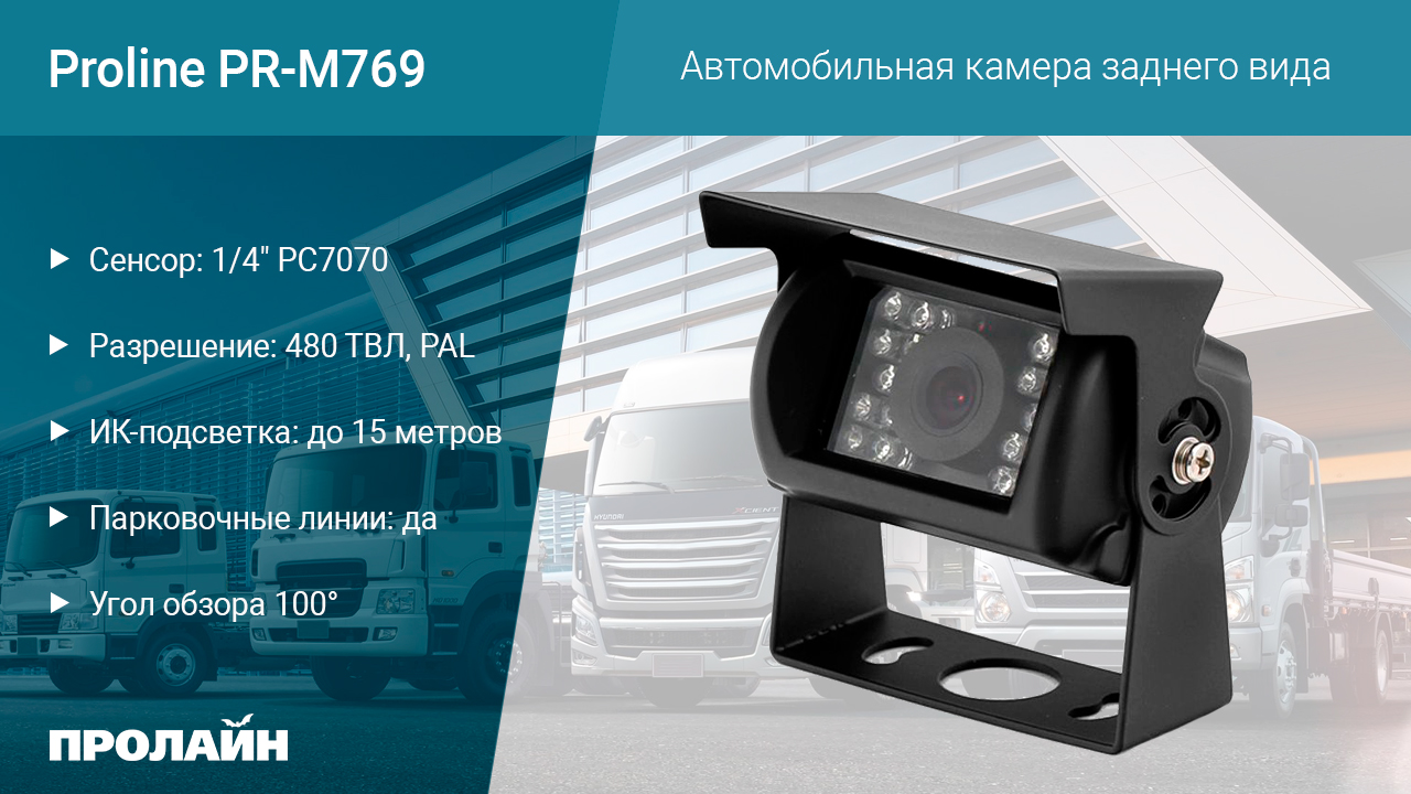 Proline PR-М769 – представляет собой автомобильную видеокамеру заднего вида, выполненную во влагозащищенном корпусе для использования в условиях низких температур и повышенной влажности. Благодаря широкому диапазону рабочих температур от -30 до +80 градусов и классу защиты IP67 (полная защита от пыли и водяных струй), камера способна функционировать за бортом автомобиля. Высококачественная цветная автомобильная видеокамера с ИК подсветкой, делающей изображение насыщенным, стабильным и качественным даже при низком уровне освещения, а благодаря ИК подсветке камера может снимать в темноте, обеспечивая отличную видимость изображения на расстоянии до 15-ти метров. Камера компактна и легко устанавливается на любую ровную поверхность, за счет специальной балки крепления, вы можете задать нужный угол обзора и зафиксировать камеру, подтянув болты. Данная камера является самым лучшим выбором для установки в общественном транспорте или в коммерческом транспорте, в местах где необходимо вести мониторинг автомобильного движения и наблюдать за правомерностью действий пассажиров.