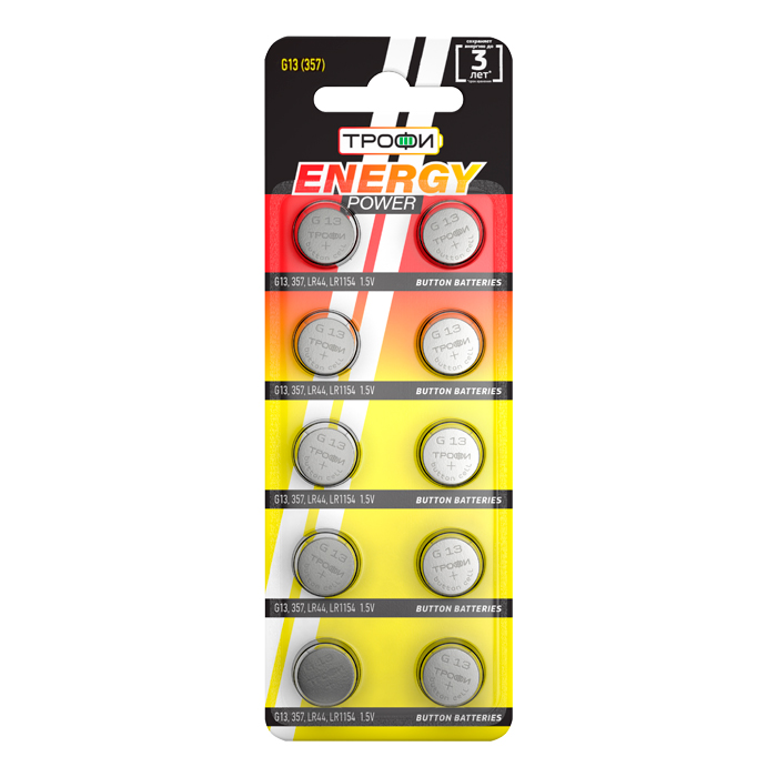 Батарейки Трофи G13 LR1154, LR44 ENERGY POWER представлены в серии профессиональных элементов питания от компании "Трофи". Они имеют типоразмер G13, в блистере 10 штук.