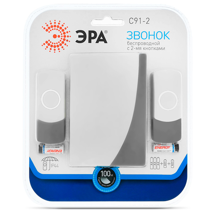 ЭРА C91-2 — беспроводной дверной звонок, к которому подключены сразу две кнопки. С радиусом действия 100 м этот он удобен для дачи или загородного дома. Каждой кнопке присвоена своя мелодия, таким образом становится понятно, у какой калитки находятся посетители. Все комплектующие питаются от батареек, не нужно подключать все части к сети.
