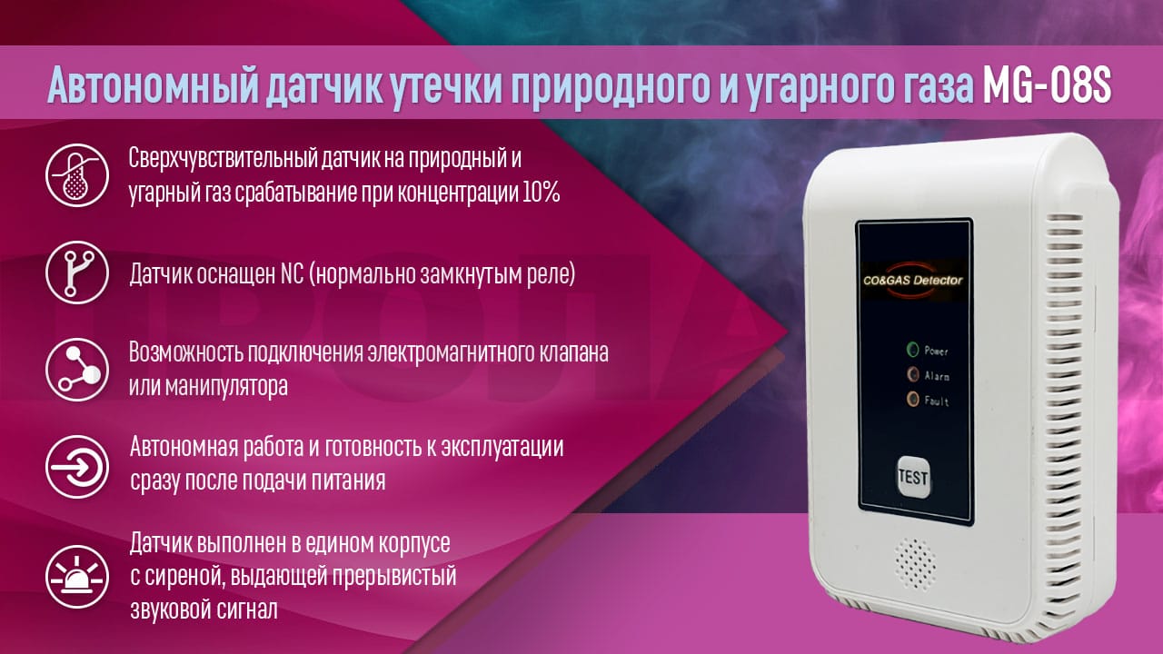 Автономный датчик утечки природного и угарного газа MG-08S предназначен для настенного монтажа. Извещатель срабатывает при обнаружении утечки природного или превышении концентрации в воздухе угарного газа и выдает светозвуковой тревожный сигнал. Электропитание устройства происходит от сети переменного тока 220 вольт. Извещатель может использоваться в частных домах и офисах.