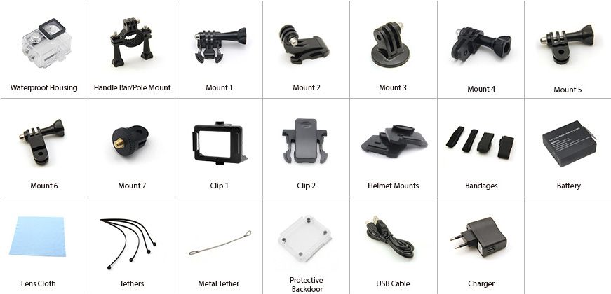 EKEN G2 1080P FULL HD это недорогая экшн камера с высоким разрешением съемки 1080p от Китайской компании EKEN. Меню камеры полностью на русском языке,а так же камера поддерживает большое количество языков (см. техническое описание). Экшн камера EKEN G2 1080P FULL HD имеет 2-х дюймовый экран и 12-ти Мп объектив с углом обзора 170°, а так же камера оснащена Wi-Fi и поставляется в комплекте с 20 различными переходниками и крепежными устройствами. С данной камерой в комплекте идет противоударный аквабокс с которым вы сможете погружаться и снимать на глубине до 20 метров. Запись производится на micro SD карту (вы может воспользоваться картой до 32 Гб). Данная модель входит в линейку ультратонких экшн камер.