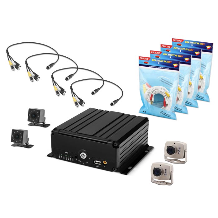 - Комплект видеонаблюдения для автошкол состоящий из: регистратора Proline PR-MDVR9704HG, 2-х камер PR-C891IRF PAL (наружные), 2-х камер PR-VD28CA 6IR (внутренние), 4-х кабелей 4PIN"п"/2RCA"м"+DJK-11"п" и 4-х кабелей для видеонаблюдения с питанием и звуком Proline PR-RCADCA03W.