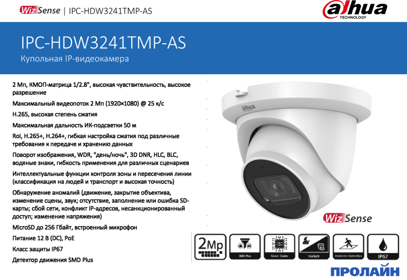 Купольная IP-камера Dahua DH-IPC-HDW3241TMP-AS-0280B 2.8mm линейки WizSense разработанная Dahua Technology включает в себя решения, в которых реализован искусственный интеллект на отдельном процессоре с алгоритмами глубокого обучения. WizSense делает акцент на распознавании таких классов объектов, как люди и транспорт, позволяя быстро реагировать именно на них. Серия IP-видеокамер Dahua WizSense 3 использует усовершенствованные алгоритмы глубокого обучения для таких интеллектуальных функций, как охрана периметра и детектор движения SMD Plus. В то же время реализованная в этой серии технология Starlight обеспечивает высокое качество изображения в условиях низкой освещенности.