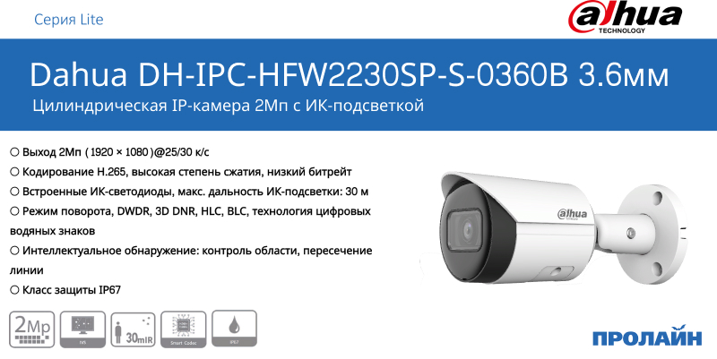 Цилиндрическая IP-камера DH-IPC-HFW2230SP-S-0360B 3.6мм серии Lite от Dahua с передовой технологией кодирования H.265 обеспечивает эффективное кодирование видео, позволяя сэкономить трафик и место для хранения данных. Максимальная разрешающая способность IP-видеокамера составляет 1920х1080 пикселей (Full HD). Благодаря поддержке технологии PoE (Power over Ethernet) питание на устройство может подаваться через витую пару. Широкую совместимость с регистраторами различных производителей обеспечивает поддержка протокола ONVIF. Поддерживается хранение данных на SD-карте, защита от пыли и влаги и антивандальная защита, соответствующие стандартам IP67